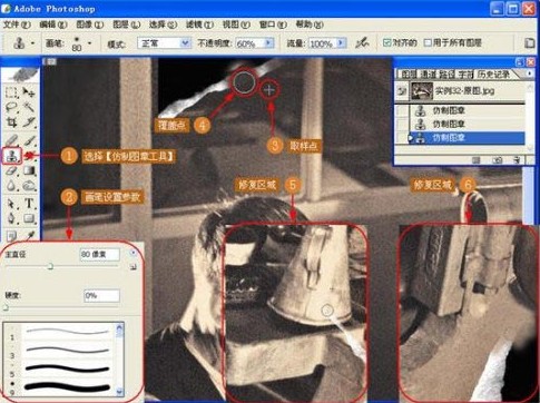 6、修复残缺图像。使用【仿制图章工具】修复照片残缺部分,如下图所示。